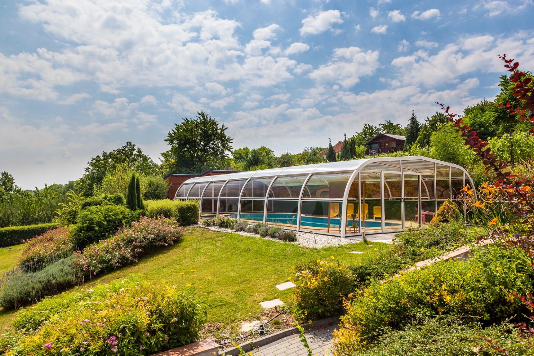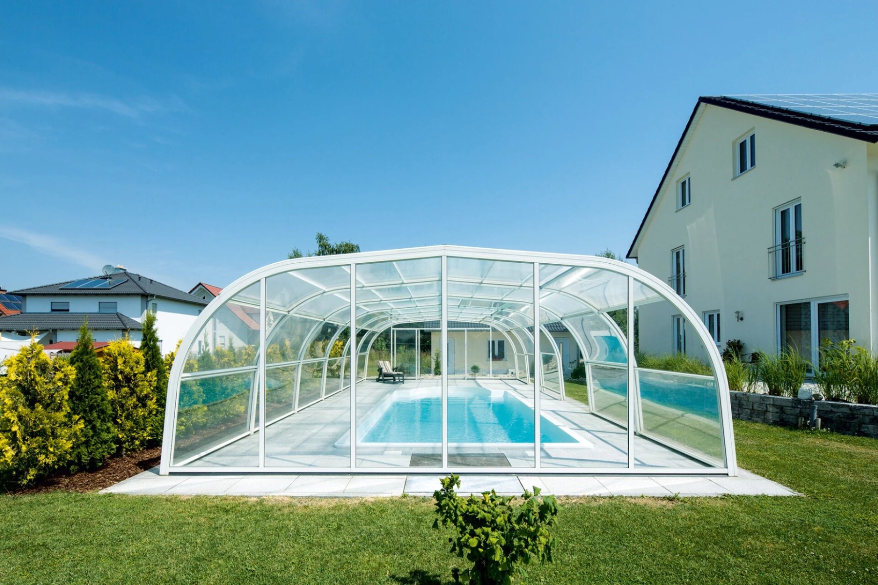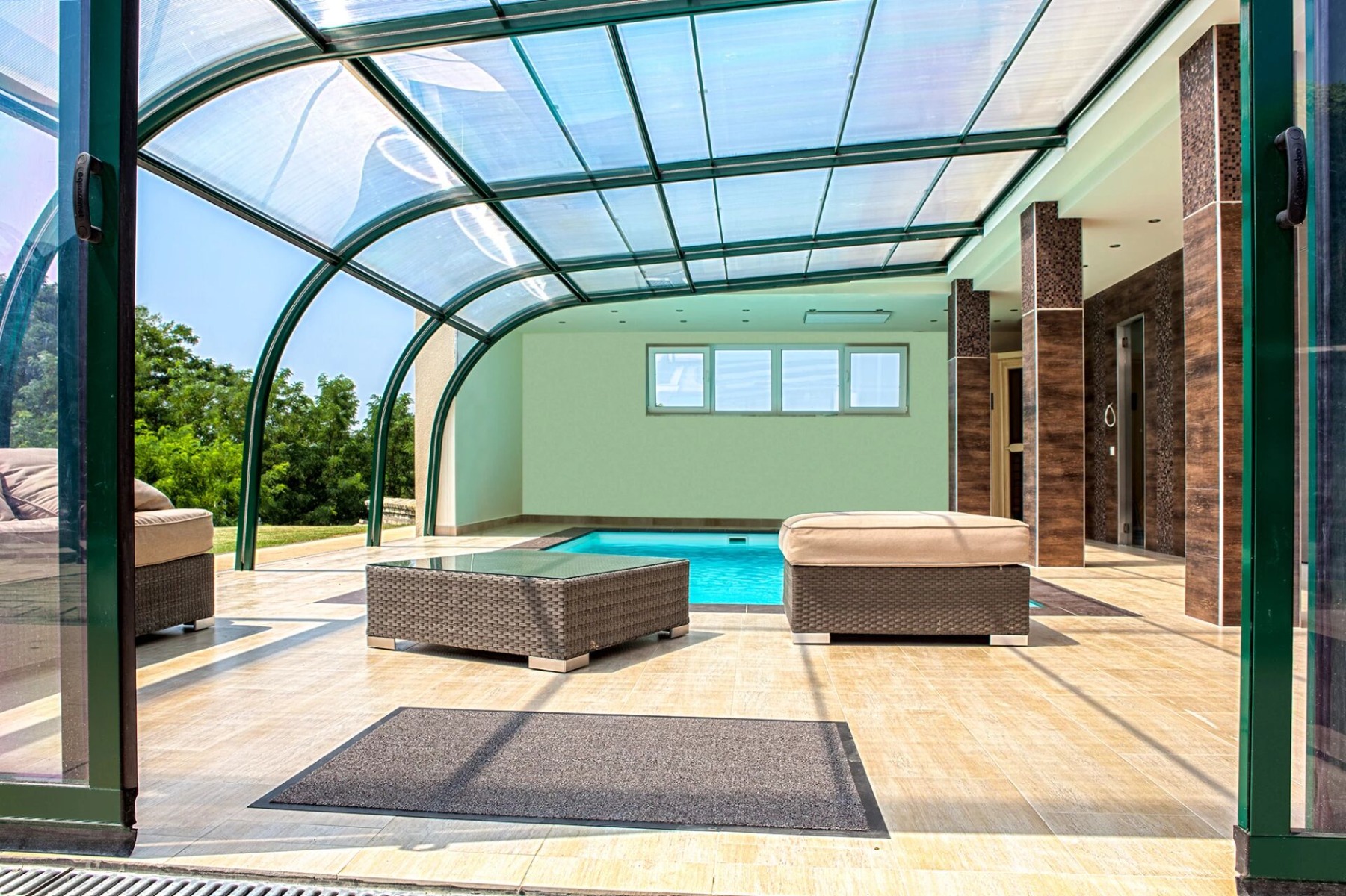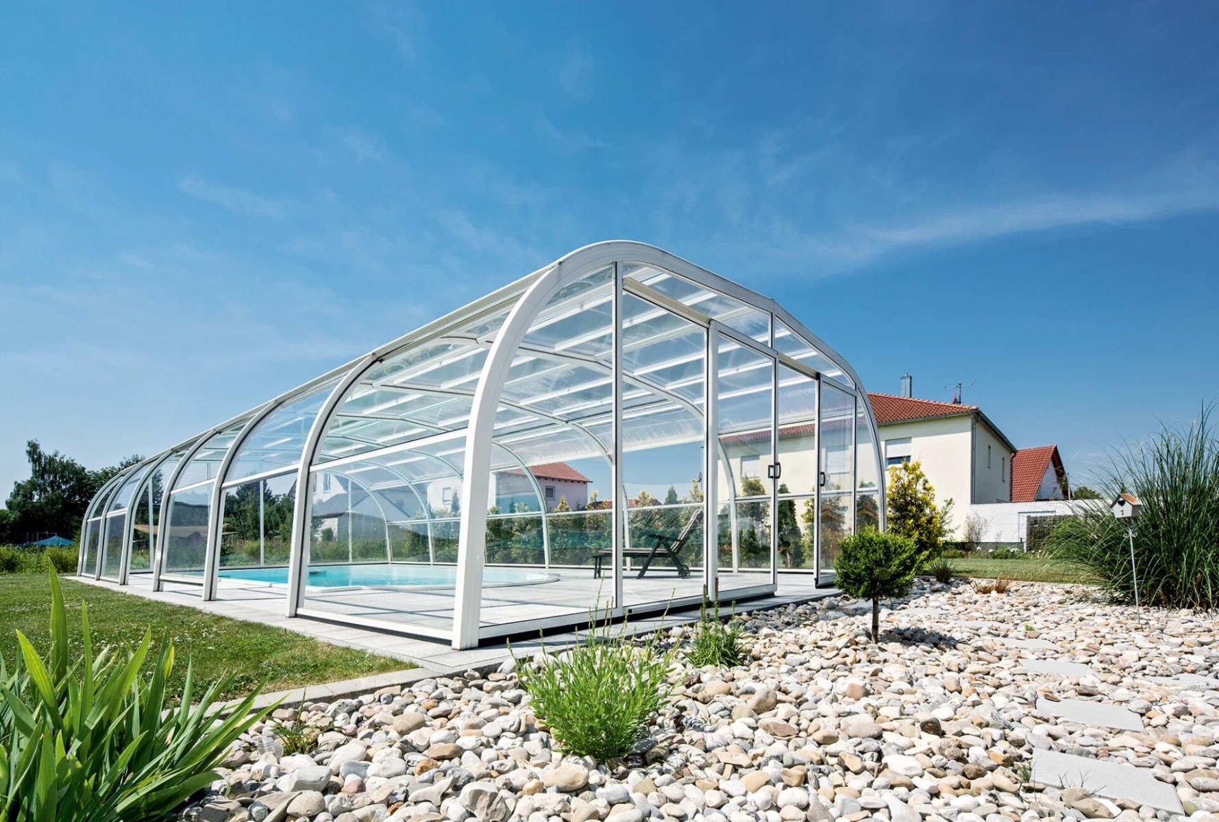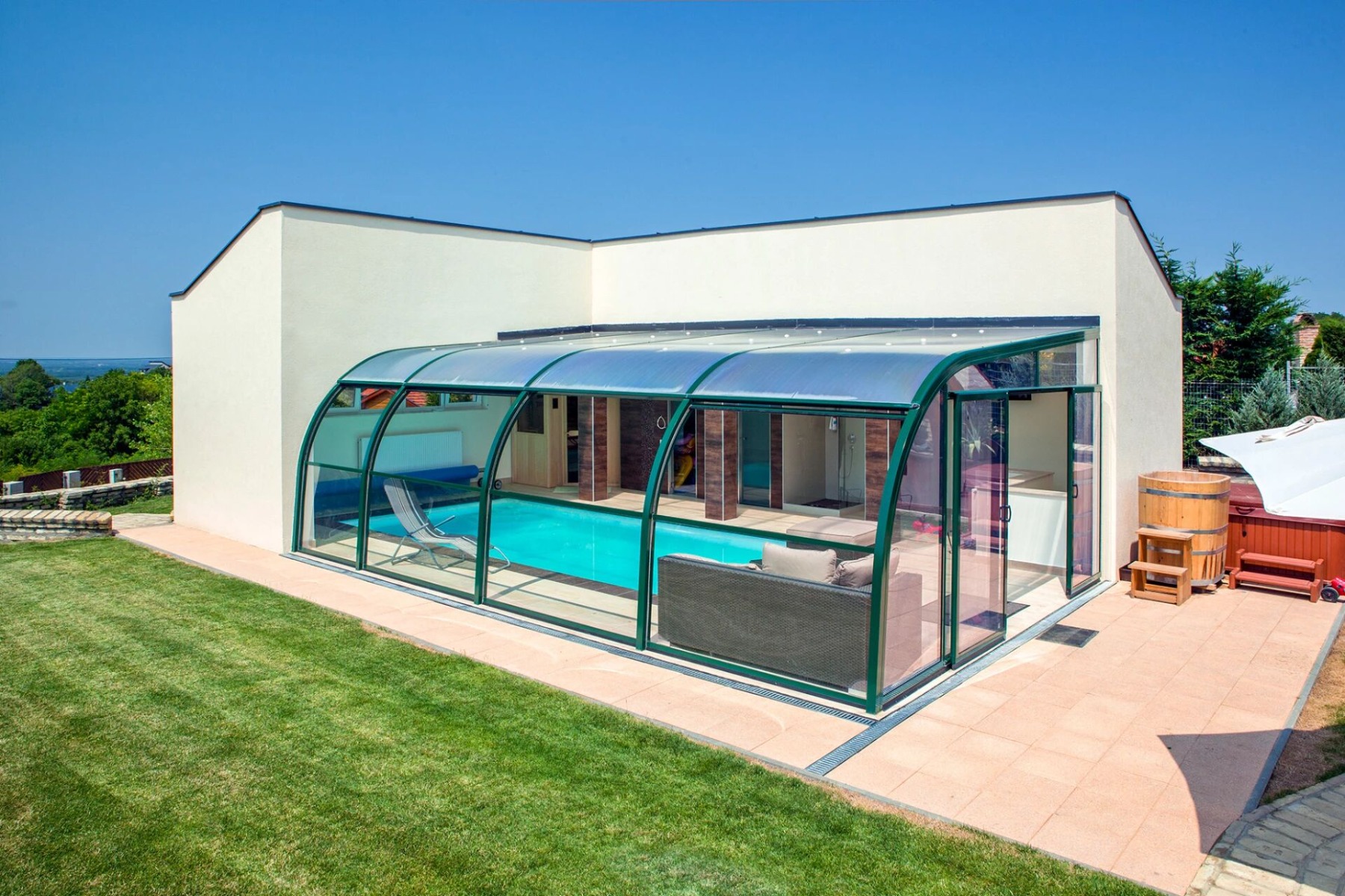 Bazénové zastřešení s obloukovým tvarem a posuvnými dveřmi.